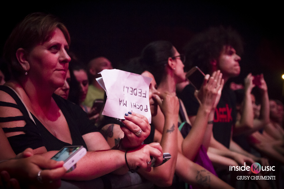 Ringrazia tutti ed esce di scena, insieme ai due fedelissimi che l’accompagnano sul palco, Tozzo alle percussioni e Alebava al synth. Ma non è ancora scoccata la mezzanotte e l’incantesimo non può essere spezzato, quindi eccolo di nuovo sul palco che imbraccia la chitarra acustica.