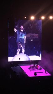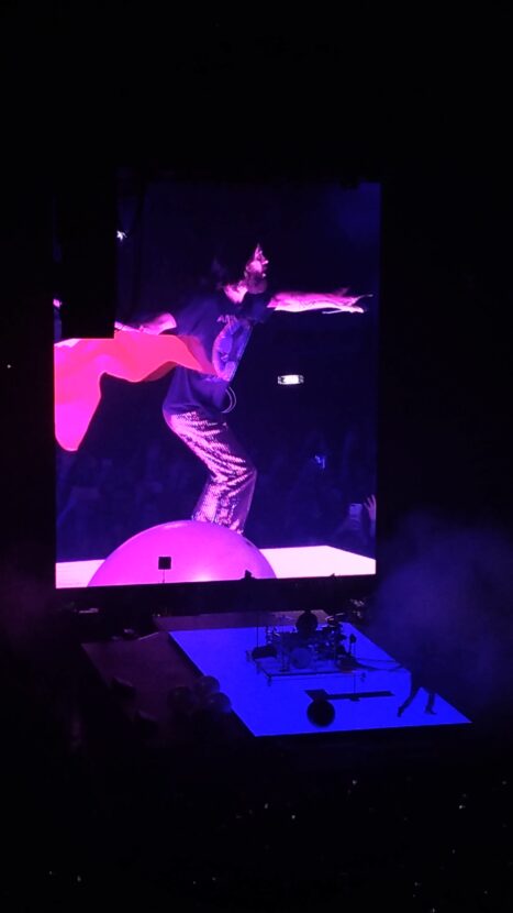 L’arena del Palalottomatica è splendidamente preparata. Un grande palco illuminato, al cui centro campeggia l’enorme batteria di Shannon, ed un grande maxischermo per non far perder nulla neanche agli sfortunati (quali la scrivente) del terzo anello. O, forse, per ricordare il famoso monolito al centro della complessa trama di 2001 Odissea nello Spazio. A quanto pare, però, la scenografia originale del tour avrebbe dovuto essere molto più complessa: oltre al grande maxischermo, anche dei pannelli illuminati avrebbero dovuto completare il tutto. Niente band d’apertura, alle 21:15 parte Monolith intro, brano dai suoni duri e cyberpunk che molto deve al compositore Hans Zimmer, autore della colonna sonora di Blade Runner 2049. Bandiere con il logo dei Thirty Second to Mars, la Triad, che Jared porta anche tatuata su un braccio, iniziano a sventolare tra la folla nel parterre.