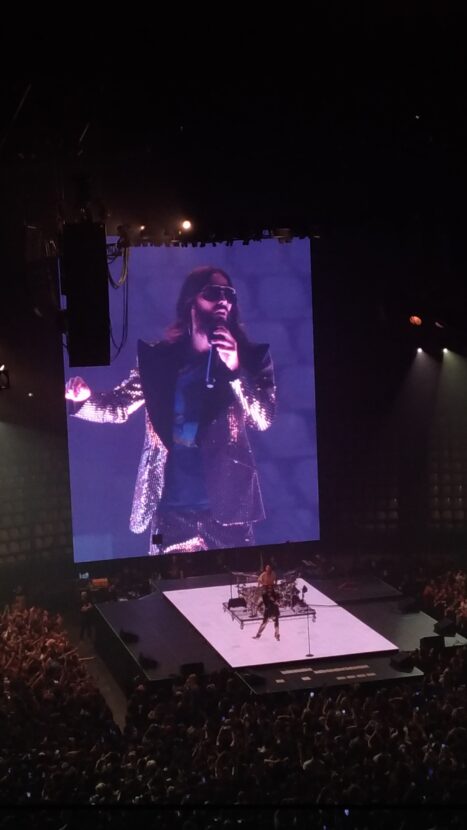 Si parte fortissimo. Up in the air, fra le canzoni più note di Love, Lust, Faith, Dreams, cui una copia del singolo è stata lanciata assieme al Falcon9 della Space X, viene cantata praticamente dal pubblico. Anche perché Jared è amplificato malissimo. Probabilmente non riesce neppure a sentire la propria voce in quanto spesso sbaglia gli attacchi. La situazione migliorerà leggermente durante il concerto, ma probabilmente l’utilizzo di basi pre-registrate non aiuta una band abituata a suonare dal vivo.